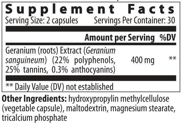 Geranium sanguineum roots with a content of polyphenols, calculated as catechin, not less than 22%, tannins, calculated as tannin, not less than 25%, anthocyanins, calculated as the sum of malvidin chloride and cyanidin chloride, not less than 0.3% and 250 mg fillers: maltodextrin, microcrystalline cellulose, magnesium stearate.
