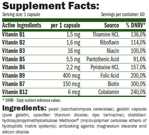 • Включва всички основни витамини от група B: B1, B2, B3, B5, B6 и B12