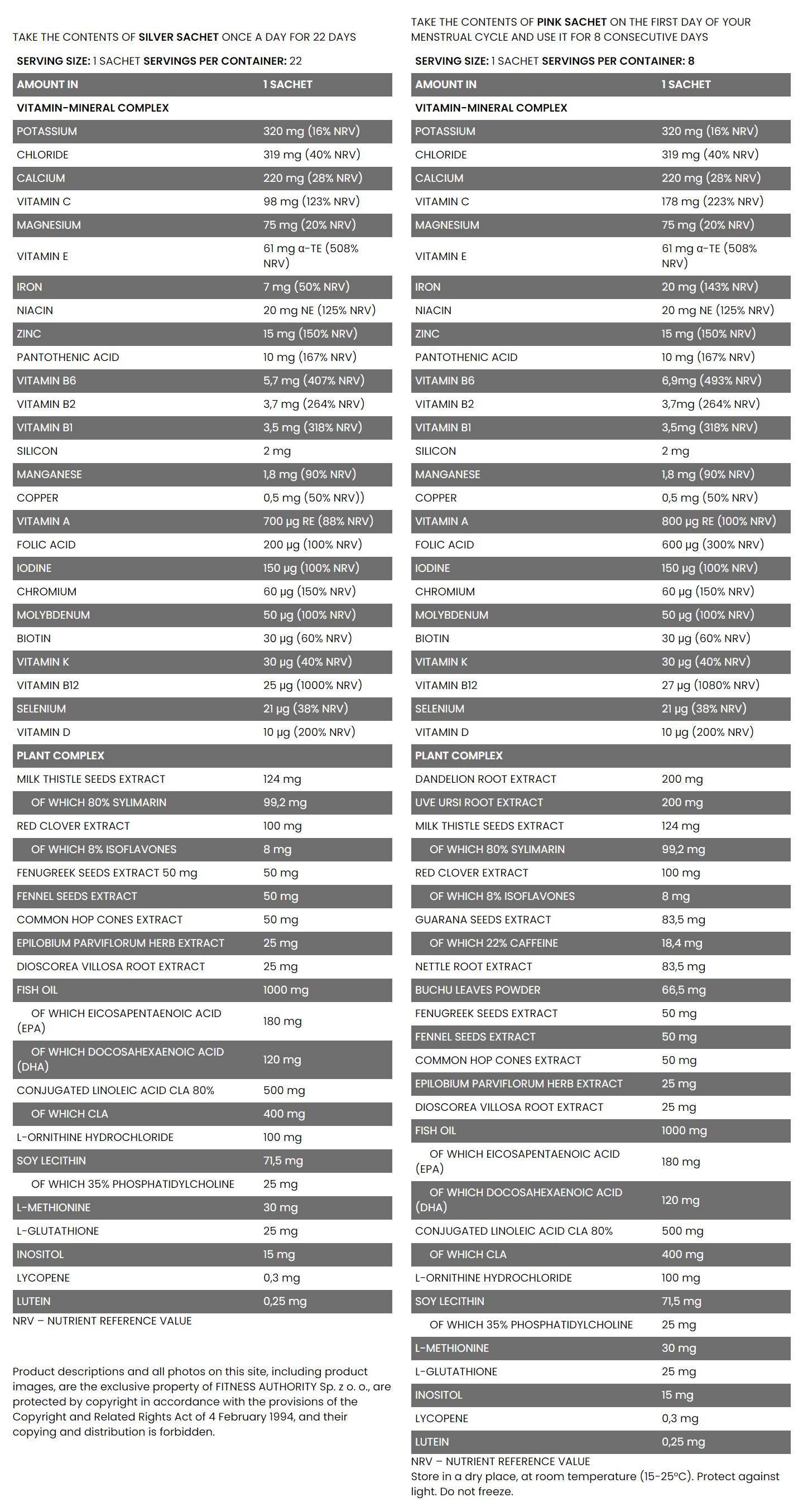 → The package contains 22 silver sachets and 8 pink sachets. The pink sachets are taken from the first day of the woman's menstrual cycle and are taken until they end or so on for 8 days in a row. The silver sachets are taken during the remaining days of the month.