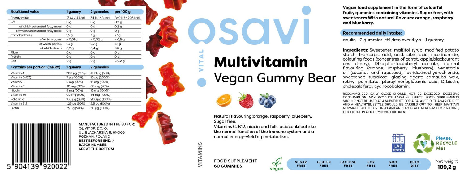 Multivitamin Vegan Gummy Bear | Orange, Raspberry, Blueberry