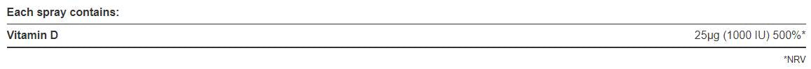 Holland & Barrett Vitamin D3 Spray is a pleasant mint-flavored oral spray. Vitamin D3 is produced in our bodies under the skin in response to exposure to sunlight. Other natural sources of vitamin D include salmon, mackerel, sardines, milk, eggs and liver. A daily vitamin D supplement may be beneficial if you do not eat meat or oily fish, cover all of your skin when outdoors, are confined to your home or rarely outdoors, or are of Asian descent. Vitamin D contributes to several important functions in the body. Vitamin D regulates the amount of calcium and phosphate needed to keep bones and teeth healthy. Suitable for vegetarians.