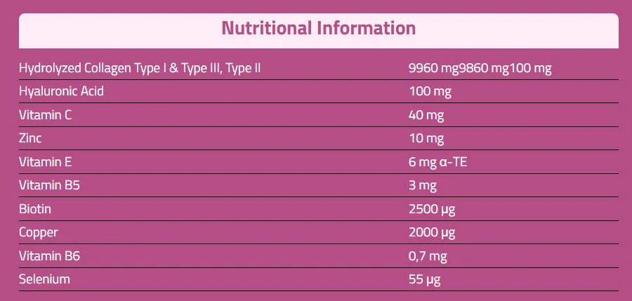 Формулата обединява колаген тип I, II и III с хиалуронова киселина, които работят синергично за еластичност, хидратация и поддръжка на костите. Това е продукт без добавена захар, обогатен с антиоксиданти и минерали за цялостна защита и грижа за външния вид.