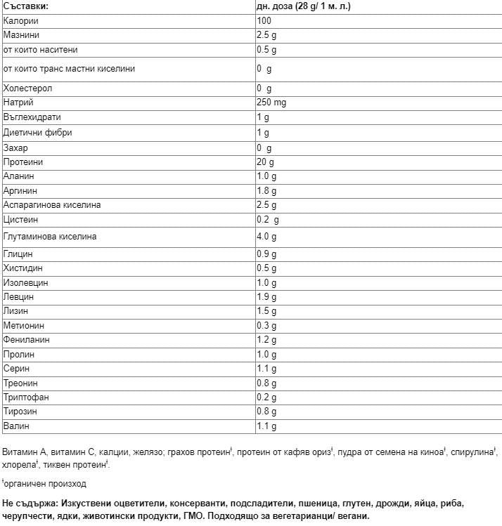 Protein is found in all plant foods, with legumes and grains being the best sources. The most popular raw material for making plant protein powders, like this one, is yellow peas. Pea protein is complete, meaning it contains all nine essential amino acids. It is also an excellent source of iron, a trace element that plays a key role in the transport of oxygen and carbon dioxide from the bloodstream.