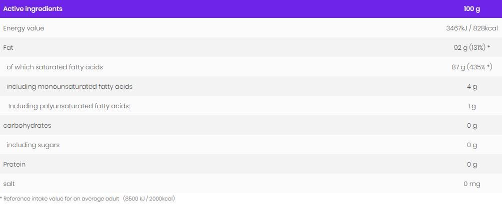 OstroVit Coconut Oil does not contain cholesterol and tannic acids, but is rich in "good fats" - monounsaturated triglycerides (MCT), mainly lypinic acid. Lapinic acid is more than 50% of the fat content in OstroVit Coconut Oil and is considered a "miracle substance". it has many health benefits.