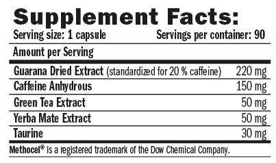 Съставът комбинира 5 мощни източника на енергия и синергично действие между кофеин, гуарана, зелен чай, йерба мате и таурин, за по-ефективно повишаване на издръжливостта и концентрацията. Бавното освобождаване осигурява постоянна енергия през целия тренировъчен процес, като подпомага мастния метаболизъм и подобрява физическото представяне. Кофеинът служи като стимулант на централната нервна система, увеличава освобождаването на адреналин и осигурява термогенен ефект, който спомага за по-висок разход на калории и запазване на мускулния гликоген.