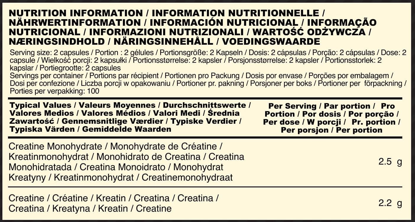 Във всеки две капсули се съдържат 2500 мг 99,9% чист CreaPure™ креатин монохидрат, доказан за бързо разграждане и максимално усвояване. Една доза е 2 капсули. Опаковките са налични с различен брой дози: 50, 100 и 150. Капсулите са удобни за поглъщане и са подходящи за редовен прием през целия тренировъчен цикъл.