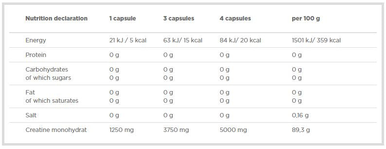 Креатин монохидратът се свързва в креатинфосфат, от който се произвежда АТФ - основният източник на енергия при високоинтензивни натоварвания. Една доза съдържа 1250 mg креатин на капсула, осигурявайки висока концентрация в една доза за по-ефективно увеличаване на енергията и силата. Продуктът подпомага мускулния растеж, подобрява издръжливостта и подпомага фокуса и концентрацията по време на тренировка. Подходящ е както за бодибилдинг и силово-технически дисциплини, така и за спортове за издръжливост, където се търси по-високо ниво на енергия.