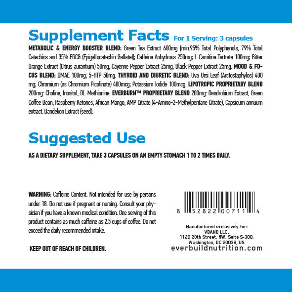 Ever Burn комбинира няколко целенасочени бленда: Metabolic & Energy Booster Blend с Л-карнитин тартрат за транспортиране на мазнини до митохондриите и термогенен ефект; Кофеинът в съчетание с екстракти от черен пипер, червен пипер и горчив портокал осигурява забележим термогенен заряд. Патентованата формула 12 HOURS ENERGY BURST™ осигурява продължителна енергия до 12 часа след приема. Mood & Focus Blend съдържа 5-HTP деривати на триптофана и DMAE за подобряване на концентрацията и настроението. Thyroid & Diuretic Blend включва хром пиколинат и калиев йодид за подкрепа на метаболизма и щитовидната функция, както и екстракт от мечо грозде за естествен диуретичен ефект. Lipotropic Proprietary Blend съдържа холин и инозитол за намаляване на холестерола и подпомагане на транспортирането на хранителни вещества, както и Л-метионин за поддържане на детоксикацията на черния дроб. EverBurn™ Proprietary Blend включва разнообразни растителни екстракти за допълнителен синергичен ефект.
