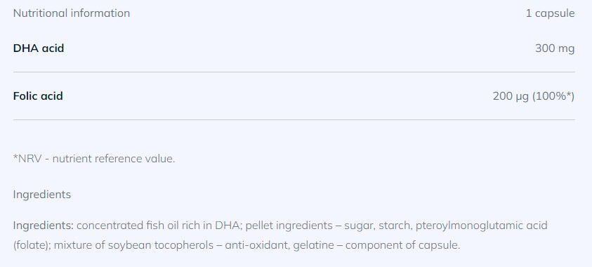 Съдържа фолиева киселина и DHA (докозахексаенова киселина) в оптимално съотношение, което подпомага нормалното развитие на нервната система и мозъка на плода, както и поддържа общото здравословно състояние на майката. Концентрираното рибено масло осигурява богато на DHA съдържание и допринася за здравето през втория и третия триместър.