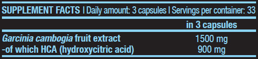 Основният актив е Гарциния Камбоджа (60% съдържание на HCA). Плодът е познат в Югоизточна Азия и се използва за добавяне на вкус, но в тази формула служи като естествен регулатор на теглото, който подпомага изгарянето на въглехидрати и складирането на гликоген в мускулите, което може да повиши енергията по време на тренировки.