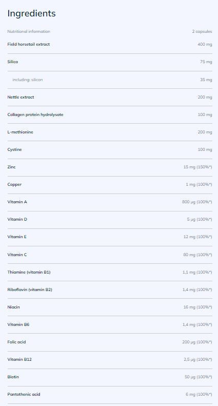 Формулата комбинира силициев диоксид със подбрани съставки като екстракт от полски хвощ, колагенов протеин хидролизат и витамини, които подкрепят структурата на тъканите и защитават клетките от оксидативен стрес. Това е полезно за комплексна грижа за кожата, косата и ноктите и осигурява основа за по-устойчива визия.