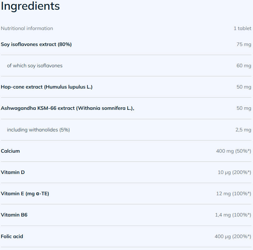 Ефективността на формулата се базира на синергия между естествени екстракти и витаминни компоненти. Соевите изофлавони подпомагат нормалния хормонален баланс, а екстрактът от обикновен хмел допринася за облекчаване на горещите вълни и промени в настроението. Компонентите като витамин D, витамин E и витамини от група B работят заедно, за да поддържат костното здраве, енергията и общото благосъстояние по време на прехода.