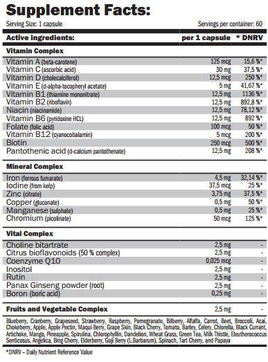 Различните минерали в продукта като желязо, цинк, йод и магнезий подпомагат правилното усвояване на витамините и натрупването на хранителни вещества, необходими по време на тренировка и интензивни физически натоварвания. Една доза е 1 капсула дневно, а опаковката съдържа 60 дози, което прави продукта удобен за дългосрочна употреба и поддържане на здравословен баланс през целия месец.
