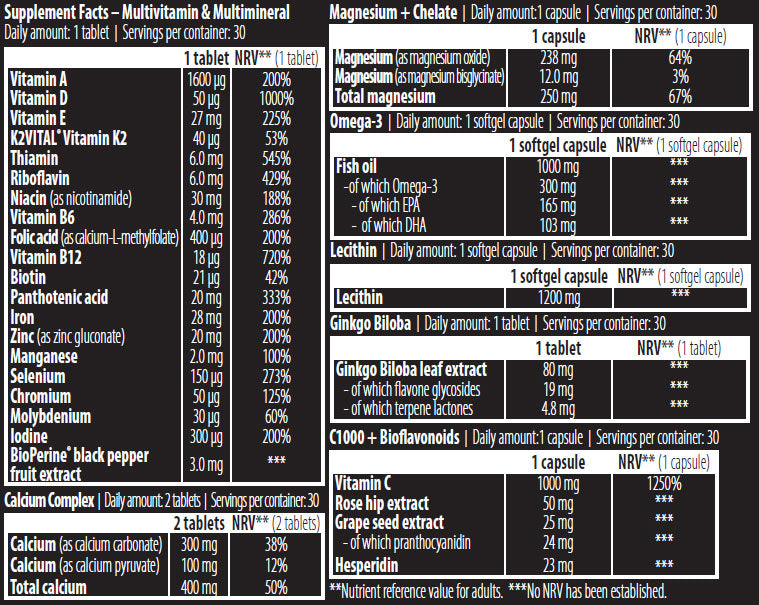 Тази комплексна формула подпомага организма с широк спектър от витамини и минерали: витамин А, витамините В1, В3, В5, В6, В9, В12, витамин C и витамин D, както и минералите калций, магнезий, желязо и цинк. В нея са добавени ценни съставки като Омега-3 рибено масло, лецитин, коензим Q-10, селен и екстракт от гроздови семки за допълнителна антиоксидантна защита. Формулата съдържа и лутеин и рутин за поддържане на зрителни функции и микроциркулация. Разфасовка: 6 таблетки/капсули на доза. Дози в опаковка: 30. Една доза: 1 опаковка.