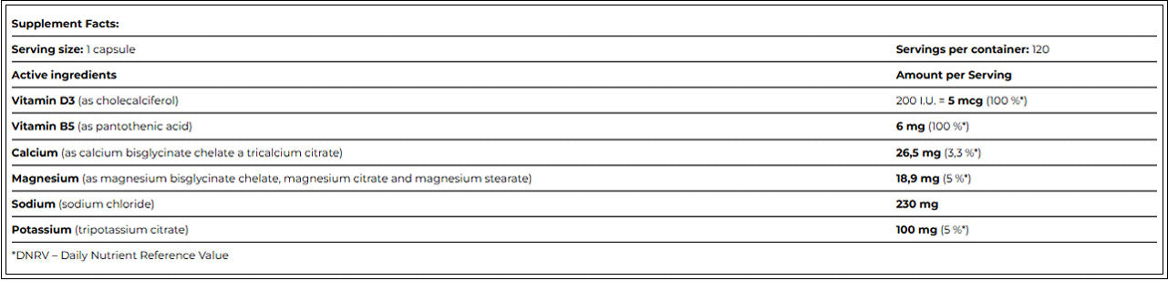 Витамин D3 подпомага поддържането на нормалната функция на мускулите и усвояването на калций, докато витамин B5 допринася за намаляване на умората и изтощението. Калцият, магнезият, натрият и калият са основни електролити, които подпомагат нервната проводимост и мускулното съкращение по време на тренировка. Удобната капсулна форма позволява лесно приемане преди или по време на активност.