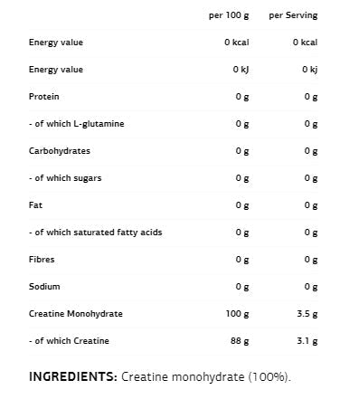 Основната активна съставка е креатин монохидрат, естествено срещащ се компонент в мускулните клетки. Той играе решаваща роля в производството на аденозин трифосфат (АТФ) – енергийната валута на тялото. Това води до повишено производство на енергия по време на тренировка, позволявайки по-интензивни и по-дълги усилия. В резултат се улеснява мускулният растеж, подобряват се силата и общата производителност, а възстановяването става по-бързо.