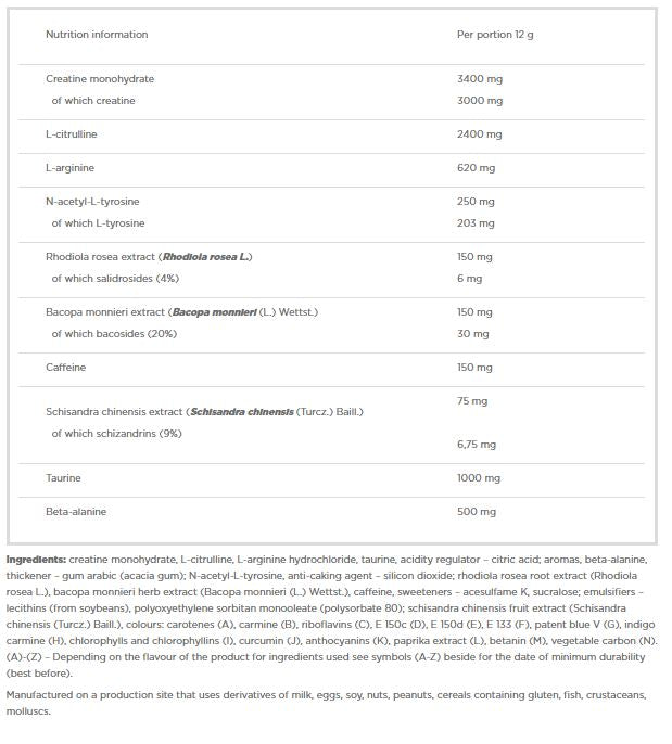 Ingredients: creatine monohydrate, L-citrulline, L-arginine hydrochloride, taurine, acidity regulator - citric acid; flavors, beta-alanine, thickener - gum arabic (acacia gum); N-acetyl-L-tyrosine, anti-caking agent - silicon dioxide; rhodiola rosea root extract (Rhodiola rosea L.), bacopa monnieri herb extract (Bacopa monnieri (L.) Wettst.), caffeine, sweeteners - acesulfame K, sucralose; emulsifiers - lecithins (from soy), polyoxyethylene sorbitan monooleate (polysorbate 80); schisandra chinensis fruit extract (Schisandra chinensis (Turcz.) Baill.), colors: carotenes, carmine, riboflavins, E 150c, E 150d, E 133, patent blue V, indigo carmine, chlorophylls and chlorophyllins, curcumin, anthocyanins, red pepper extract, betanin, plant carbon