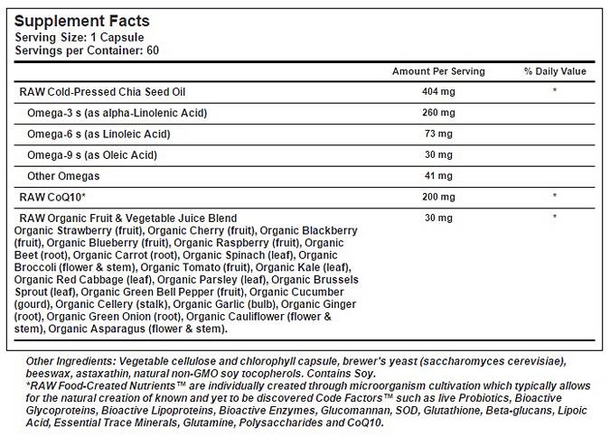 Raw Coenzyme Q10™ is a powerful formula that delivers 200 mg of raw Coenzyme Q10 per serving. With a combination of cold-pressed chia seed oil (with Omega 3, 6 and 9) and 22 raw and organically grown fruits and vegetables, fat-soluble raw Coenzyme Q10™ supports cardiovascular health, cell division and provides antioxidant protection.