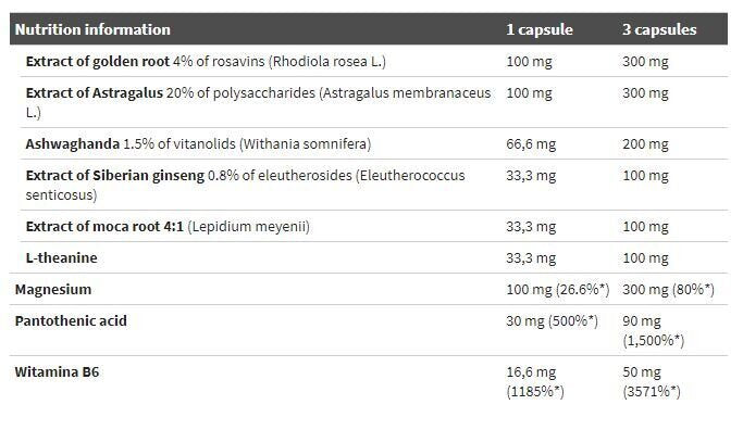 Ingredients: golden root extract, astragalus extract, ashwagandha extract, Siberian ginseng extract, maca root extract, L-theanine, magnesium oxide, calcium D-pantothenate - pantothenic acid, pyridoxine hydrochloride (vitamin B6), microcrystalline filler, cellulose magnesium stearate - anti-caking agent, capsule (gelatin - coating ingredient, color: E171