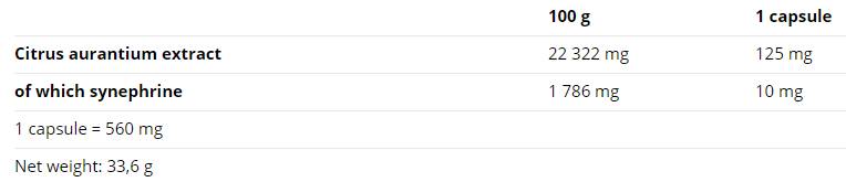 125 mg of petitgrain oil extract in one capsule - the maximum permissible daily dose - 10 mg of synephrine. Stimulates thermogenesis in the body, which increases energy expenditure throughout the day. Helps burn fat, both during physical activity and at rest.