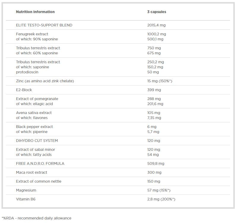 Съставът включва Трибулус терестрис с 60% сапонини, който подпомага естественото производство на тестостерон и има адаптогенно действие. В допълнение са добавени Мака и Сминдух за усилване на либидото и общото представяне. В формулата са включени цинк, магнезий и витамин B6 (ZMA), както и други витамини и минерали, които поддържат доброто здраве, намаляват нервното напрежение и подпомагат настроението.
