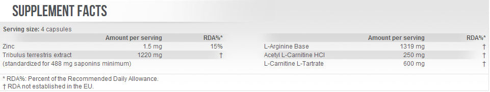 Tribulus terrestris (бабини зъби) стимулира лутеинизиращия хормон (LH) в предната част на хипофизната жлеза, което насърчава естественото производство на тестостерон. Нашият TRIBU-X концентрат е силно концентриран източник на сапонини, които подпомагат този процес. В добавка D-аспарагинова киселина е клинично одобрена съставка, която допълва повишаването на тестостерона. Продуктът съдържа и Л–карнитин и ацетил-L–карнитин, за да се предотврати спадът на тестостерона от дневния стрес и тренировките и да се стимулират андрогенните рецептори. Аргининът разширява кръвоносните съдове и подпомага еректилната функция.