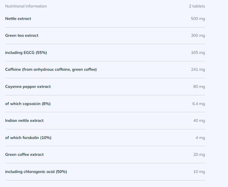 Съставът включва екстракт от коприва и зелен чай, кофеин безводен, лют червен пипер и SINETROL® – патентован екстракт от гуарана и цитрус, допринасящи за по-ефективно използване на мазнините и повишаване на силата и издръжливостта.