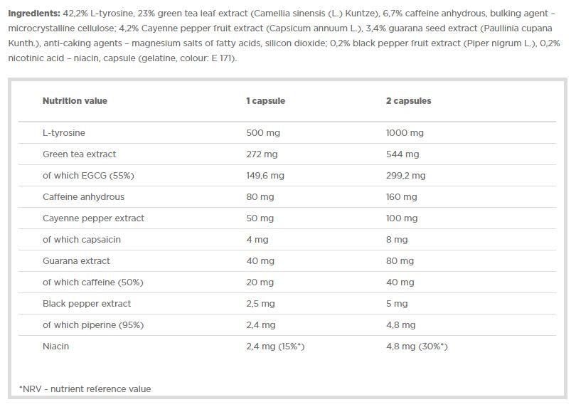 Thermo Speed Extreme 2.0 е силно концентрирана формула с прецизни съставки, която помага да се справиш с излишните килограми. Компонентите в нейния състав работят синергично: кофеинът и гуараната осигуряват силно стимулиране на централната нервна система, което повишава енергията и концентрацията, докато зеленият чай екстракт подпомага термогенезата и обмяната на веществата. Ниацинът допринася за нормалния обмен на енергия, а L-тирозин подпомага поддържането на психическата активност по време на тренировка.