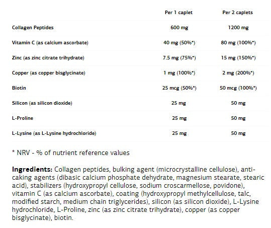 Уникалната формула комбинира 1200 mg висококачествени колагенови пептиди с витамини и минерали, които стимулират естественото производство на колаген в организма. Това подпомага по-здрави кожни структури, по-устойчиви коси и силни нокти. Допълнително съдържа витамин C, биотин и цинк, които са важни за храненето на кожата, косата и съединителните тъкани и допринасят за защита на клетките от оксидативно увреждане.