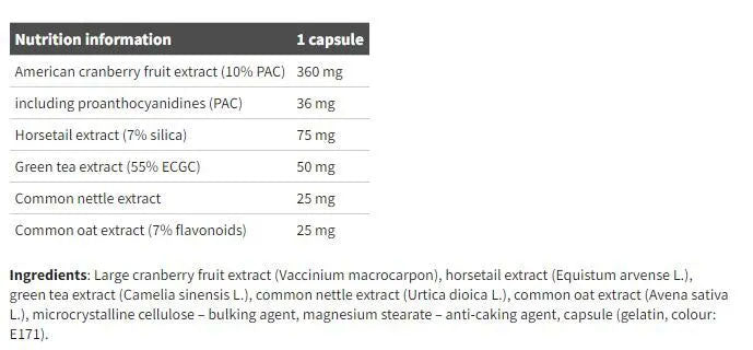 Екстрактът от червена боровинка осигурява антиоксидантна защита и подпомага здравето на пикочните пътища, докато хвощът, коприва и зеленият чай допринасят за допълнителна подкрепа чрез естествени вещества. Овесът в композицията допринася за общото благосъстояние, а капсулното формулиране осигурява удобство и редовност в приема.