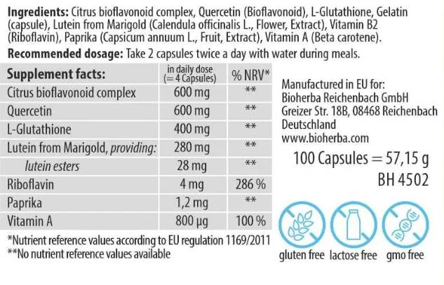 Тази специална формула включва комбинация от витамини и хранителни вещества, известни със своите ползи за зрението. Обогатена с антиоксиданти, тя помага за предпазване на деликатните очни тъкани от свободни радикали и може да подобри циркулацията в областта на очите, намалявайки умората при продължително натоварване на зрението.