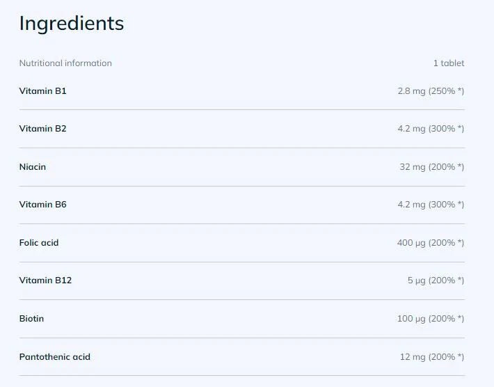 Съставки: пълнители – микрокристална целулоза, омрежена натриева карбокси метил целулоза; никотинамид – ниацин, лактоза, калциев D-пантотенат – пантотенова киселина, образуващ агент – калциев фосфат; пиридоксин хидрохлорид – вит. B6, цианокобаламин – вит. B12, рибофлавин – вит. B2, тиамин мононитрат – вит. В1, средство против слепване – магнезиев стеарат; птероилмоноглутаминова киселина – фолат, D-биотин, глазиращи агенти – поливинил алкохол, полиетилен гликол, талк, калиев алуминиев силикат, полиоксиетилен сорбитан моноолеат; цветове – титанов диоксид, железен оксид