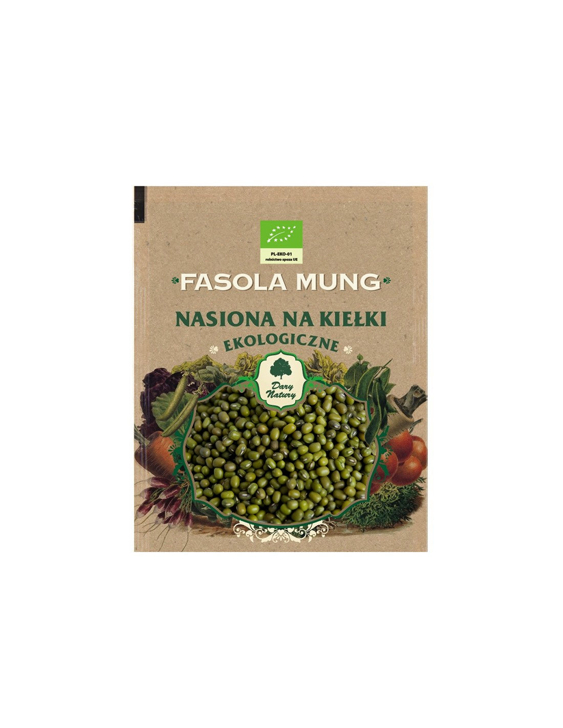 EKO nasiona na kiełki Fasola MUNG 50g представлява еко семена от боб мунг за отглеждане на кълнове. Бобът мунг (Vigna radiata) е растение широко изпозвано в кухнята на Китай и други страни от Югоизточна Азия. Консумацията на боб мунг подсилва имунитета и обмяната на веществата, стимулира производството на червени кръвни телца, също така намалява риска от сърдечно-съдови заболявания. Подходящ е за вегетарианците, а според Аюрведа е препоръчителна храна за всеки телесен тип хора, като им доставя достатъчно енергия и ценни вещества. Количеството на витамините и минералите по време на покълването се увеличават неколкократно. Кълновете от боб мунг са богати на витамини А, С и цялата група В, така и на необходимите за организма храносмилателни и антиоксидантни ензими.