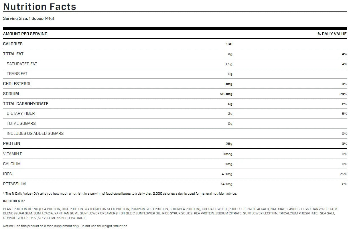 Съставки: смес от растителни протеини (грахов протеин, оризов протеин. протеин от семена на диня, протеин от тиквени семена, протеин от нахут), какао на прах (обработено с алкали), естествени аромати. по-малко от 2 % от: смес от гуми (гума гуар, гума акация, гума ксантан), слънчогледов крем (високоолеиново слънчогледово масло. твърди частици оризов сироп. белтъчини от pea. натриев цитрат. слънчогледов лецитин, трикалциев фосфат), морска сол, стевиолови гликозиди (стевия), сукралоза.
