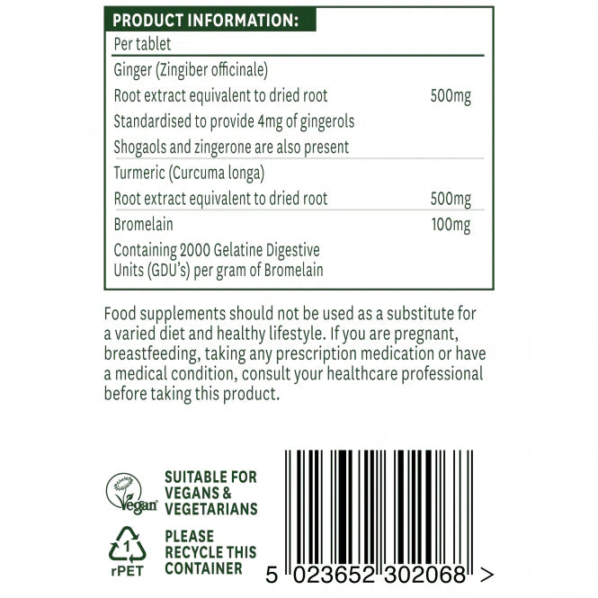Natures Aid Ginger, Turmeric & Bromelain е уникална синергична формула, комбинираща три забележителни ботанически съставки в една удобна таблетка.