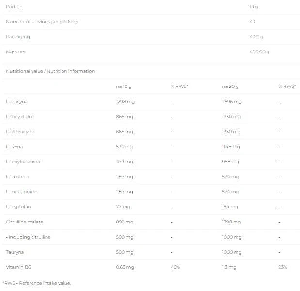 Състав: L-левцин, L-лизин, L-треонин, аромати, L-валин, L-изолевцин, L-аргинин, лимонена киселина, L-метионин, L-фенилаланин, L-хистидин, L-триптофан, оризово нишесте, сукралоза, силициев диоксид, багрило (E124).