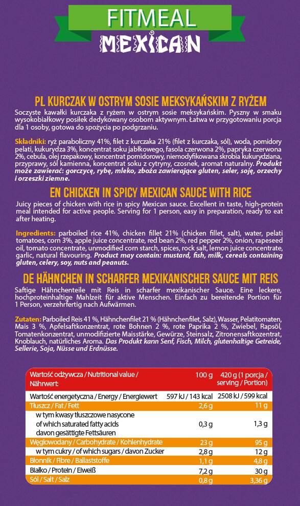 FitMeal Мексикански е продукт на номер едно бранд за течни хранителни добавки, който предлага високо-протеинова храна, готова за консумация. Съдържанието на бързи протеини в комбинация с вкусни мексикански подправки, прави това ястие не само питателно, но и изключително вкусно. Високото съдържание на протеини подпомага мускулната маса и ускорява възстановяването след тренировка, което е научно доказано. Продуктът е идеален за хора, които водят активен начин на живот и търсят бърз и лесен начин за хранене без компромис с качеството.