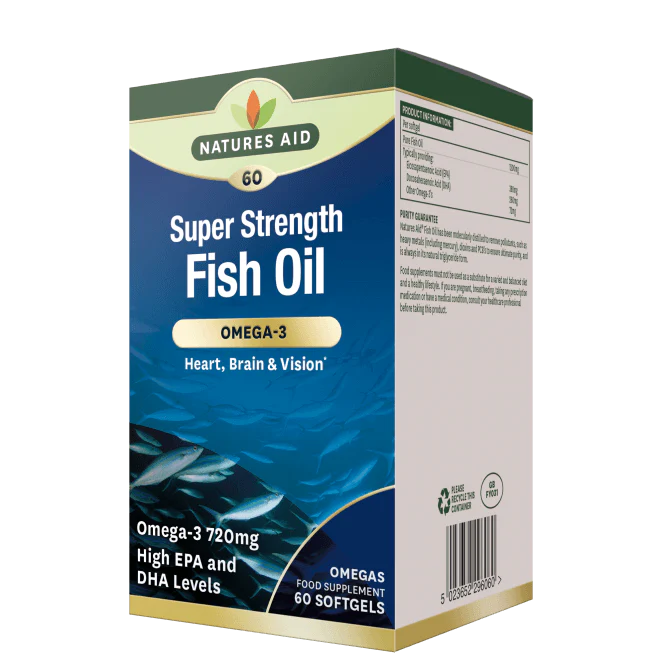 Natures Aid Super Strength Fish Oil капсулите съдържат концентрирана и пречистена форма на есенциални мастни киселини, особено EPA и DHA, общо 720мг. Подпомагат поддържането и нормалната функция на сърцето, нормална мозъчна функция и зрение. Противовъзпалителните свойства на омега-3 мастните киселини предпазват от тежки здравословни заболявания, сърдечно-съдови заболявания, рак, диабет тип 2. Подобряват циркулацията на кръвта в организма, повишават здравината на клетъчните мембрани, участват в процеса на подобряване на кръвното налягане, спомагат при алергични и възпалителни реакции, увеличават нивата на хормона на растежа.
