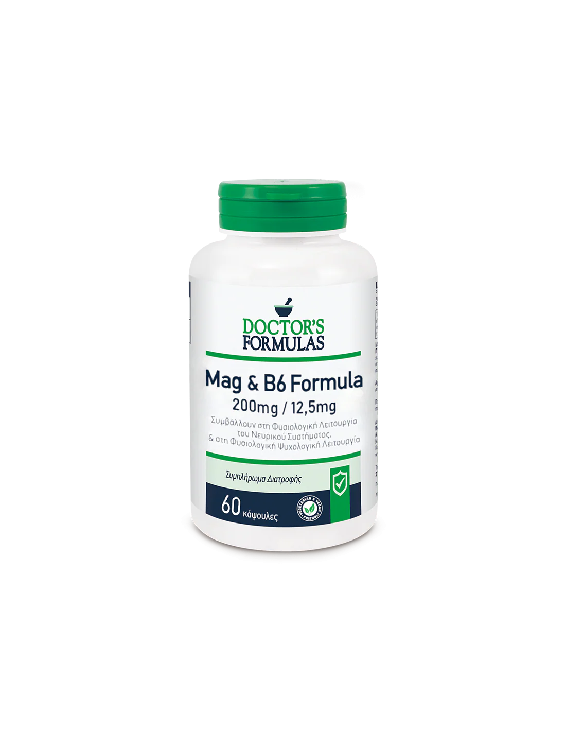 Маg and B6 Formula (Магнезий + витамин В6), 60 капсули, е хранителна добавка на Doctor's Formulas. Формулата на продукта допринася за поддържането на здравето на нервната система и подпомага психичната функция.