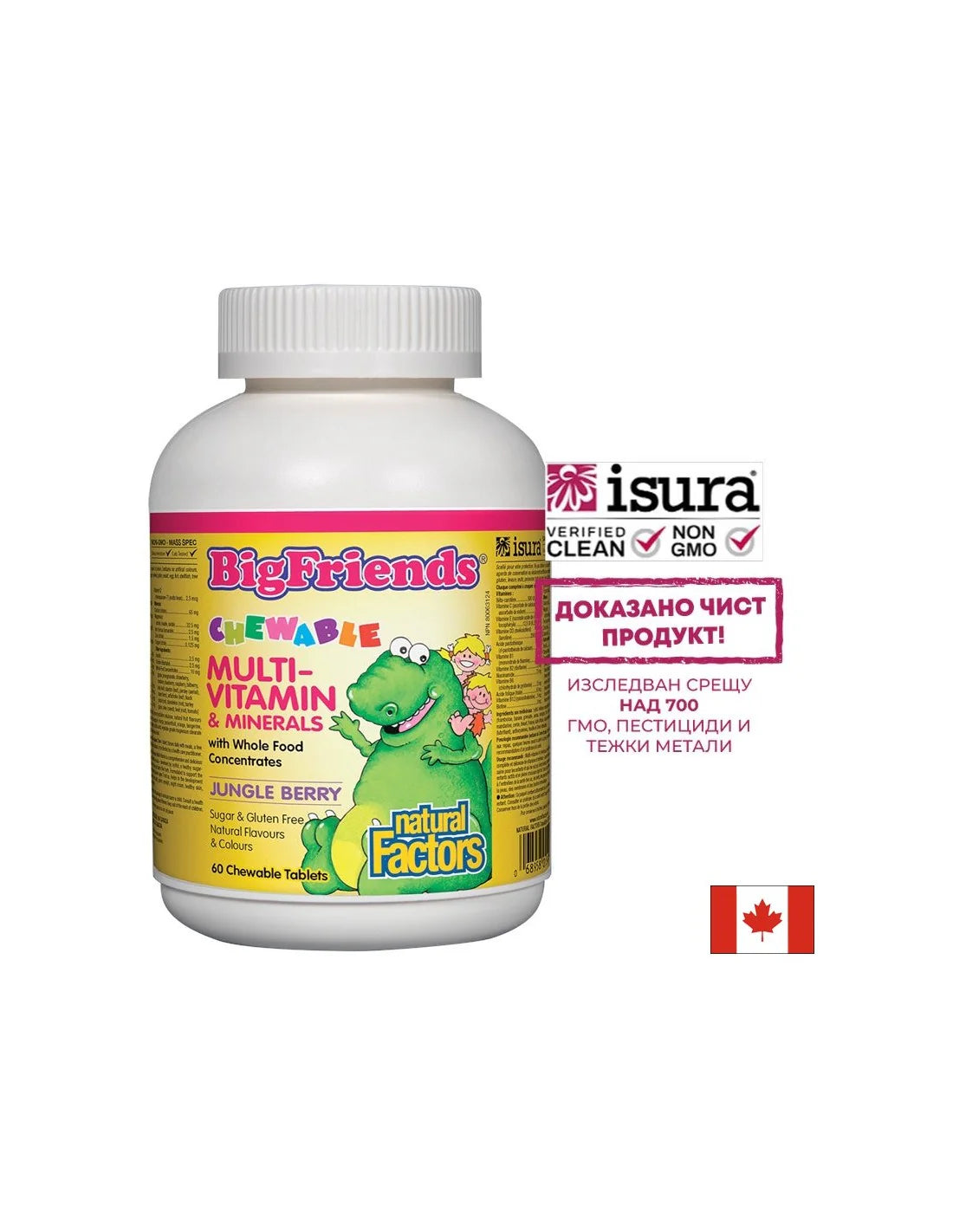 Мултивитамините и минерали Big Friends представляват пълноценна и вкусна формула с витамини и минерали – подсладена с ксилитол, здравословна алтернатива без захар за деца, която не уврежда зъбите. Създадени за поддържане на доброто здраве на активни и растящи деца на възраст над 3 години. Помага за развитието и поддържането на здрави кости, зъби, венци, зрение, нощно виждане, здрава кожа, мембрани и имунна система.