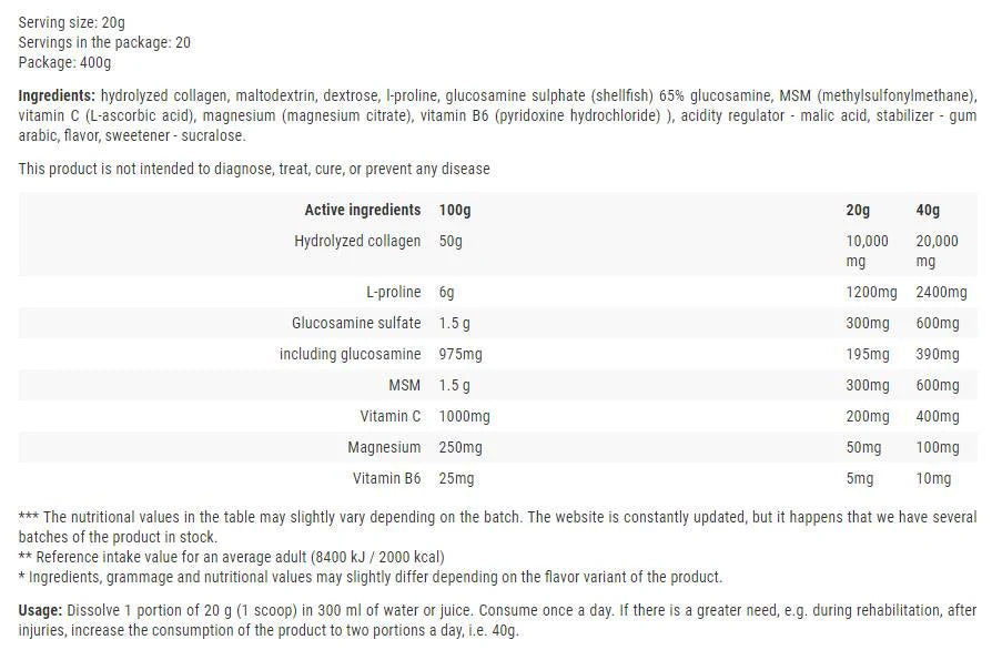 Хидролизиран колаген, който е по-лесно усвоим и с по-висока бионаличност. Колагенът изгражда нашите сухожилия, стави, кости, кожа и коса. С времето количеството му в нашия организъм намалява, което от своя страна води до – болки в ставите, чуплива коса, суха кожа и т.н.