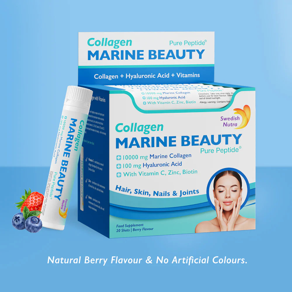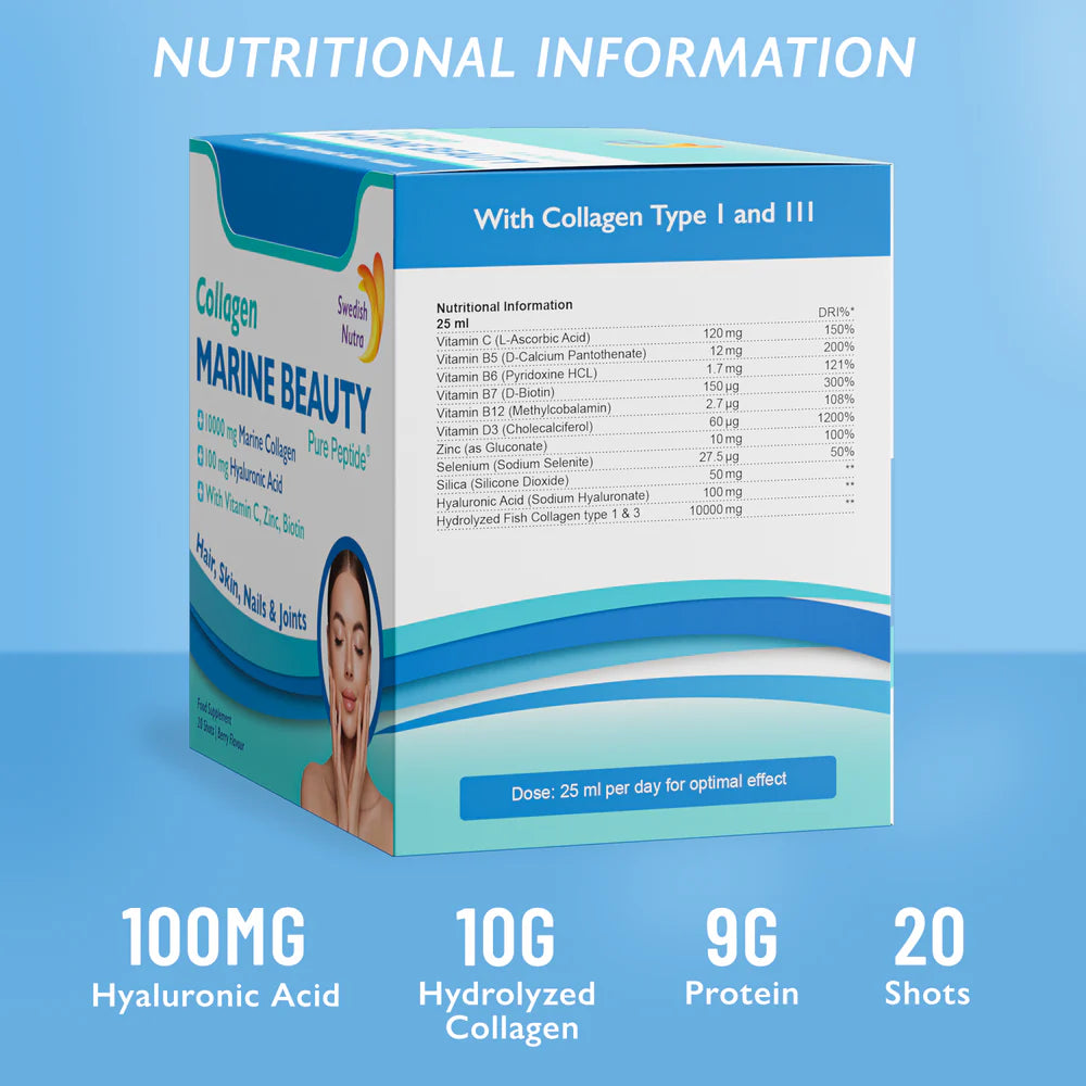 Рибният колаген от Swedish Nutra е с висока бионаличност и бързо усвояване от организма, благодарение на своята молекулна структура. Съдържа хидролизиран колаген тип 1, който е основен за здравето на кожата, косата и ставите. Комбиниран с хиалуронова киселина и витамини, той подхранва кожата на клетъчно ниво, правейки я по-сияйна и гладка.