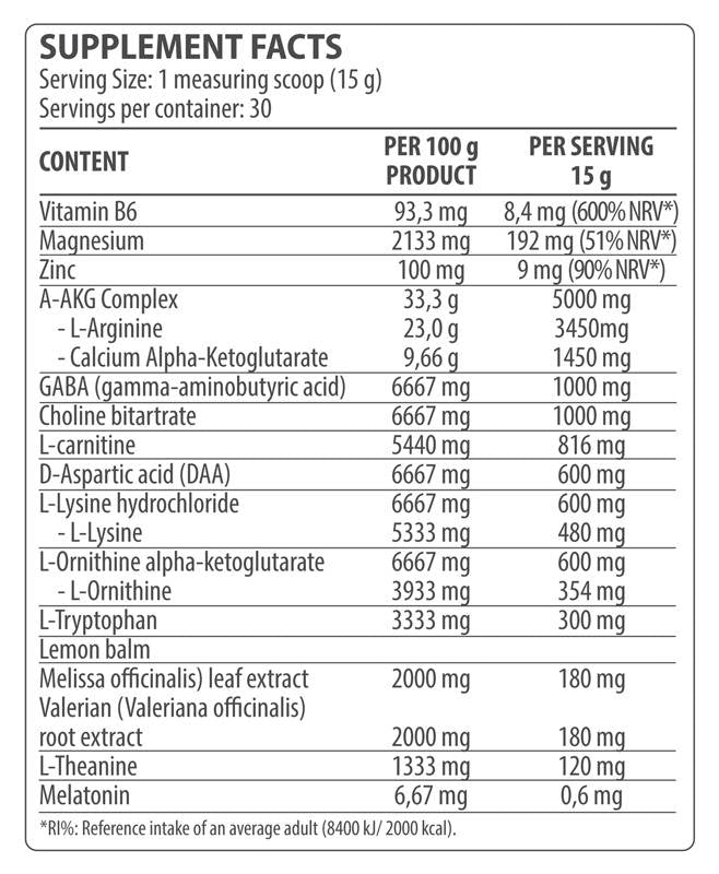 Комбинацията между аминокиселини, гама-аминобутирова киселина, витамин В6, магнезиев цитрат, цинков глюконат и билкови екстракти ще помогне на тялото Ви да защити клетките си от вредното влияние на свободните радикали и ще осигури оптимално възстановяване и презареждане на организма по време на нощния сън.