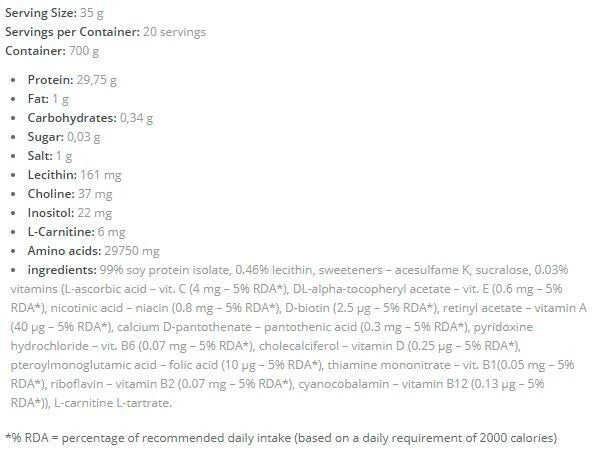 Съставки: 99% соев протеинов изолат, 0,46% соев лецитин, подсладители - ацесулфам К, сукралоза, цикламати; 0,03% витамини (L-аскорбинова киселина - вит. С, DL-алфа-токоферилацетат - вит. Е, никотинамид - ниацин, D-биотин, ретинилацетат - вит. А, калциев D-пантотенат - пантотенова киселина, пиридоксин хидрохлорид - вит. B6, холекалциферол - вит. D, птероилмоноглутаминова киселина - фолат, тиамин мононитрат - вит. B1, рибофлавин - вит. B2, цианокобаламин - вит. B12), 0,03% L-карнитин-L-тартарат
