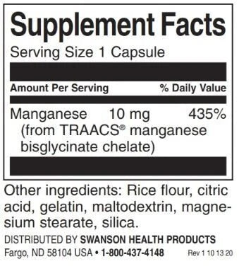 Манганът е микроелемент, който е от съществено значение за метаболизма и антиоксидантната защита. Добавката на Суонсън с хелатиран манган от Албион осигурява силно бионалична форма на това важно хранително вещество. Манганът е малко известен, но важен за здравето минерал. Той е съществен за правилния растеж и поддържа цялостното здраве през целия живот. Манганът функционира като коензим за улесняване на храносмилането и използването на въглехидратите, мазнините и протеините. Освен това той играе роля в образуването на костите и поддържа здравето на мускулите. Манганът също е важен за оптималното функциониране на SOD (супероксид дисмутаза), един от основните антиоксидантни ензими в тялото.