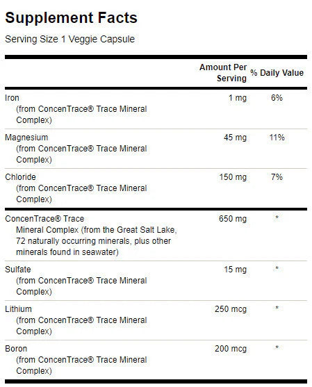 Минералната формула ConcenTrace е естествено извлечена от Голямото солено езеро в щата Юта. Тя включва балансиран, пълноспектърен комплекс от 72 естествено срещащи се минерали, както и други минерали, които се откриват в морската вода. Комбинирана с естествената сила на люцерната (алфалфа) за по-голяма стабилност, тази мощна формула е около 26 пъти по-концентрирана от други конкурентни добавки. Това обаче съвсем не е всичко. Минералите в комплекса ConcenTrace са в естествено йонно състояние, което им позволява да се абсорбират бързо от организма за постигане на максимална ефективност. А това, че те са извлечени от Голямото солено езеро гарантира възможно най-висока степен на чистота. Ще усетите веднага разликата
