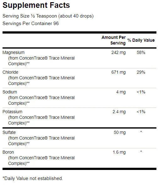 Препоръчителна употреба: Като хранителна добавка, смесете 1/2 чаена лъжичка (40 капки) с течност, сок или храна по време на хранене, за да туширате концентрирания минерален вкус. Изпийте след това чаша вода или сок. Приемайте един до два пъти на ден. Умерените дози са безопасни, но приемът на по-големи количества може да има слабително действие. ВНИМАНИЕ: Консултирайте се с вашия лекар преди употреба, ако сте бременна или кърмите