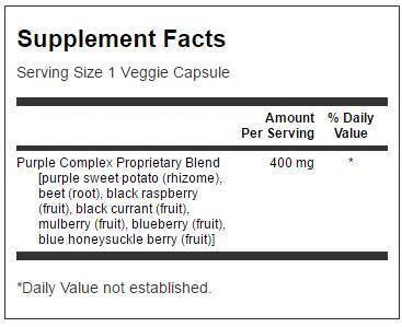 Ако в древността пурпурният цвят е символизирал царственост, то в днешно време е цветът на флавоноидните пигменти, известни като антоцианини, които са сред най-ефективните природни неутрализатори на свободните радикали. Сега най-богатите природни източници на тези лилави протектори са комбинирани в една хранителна добавка: нашият нов пурпурен антиоксидантен комплекс от плодове и зеленчуци. Събрали сме най-мощните антоцианини от цели плодове и зеленчуци, включително лилави сладки картофи, корени от цвекло, боровинки, касис, черни малини, черница и сини орлови нокти. Всички тези храни се радват на голямо внимание, благодарение на своето впечатляващо съдържание на флавоноиди. Увеличете своята защита срещу свободните радикали, като приемате ежедневно специалните капсули с пурпурни антиоксиданти.