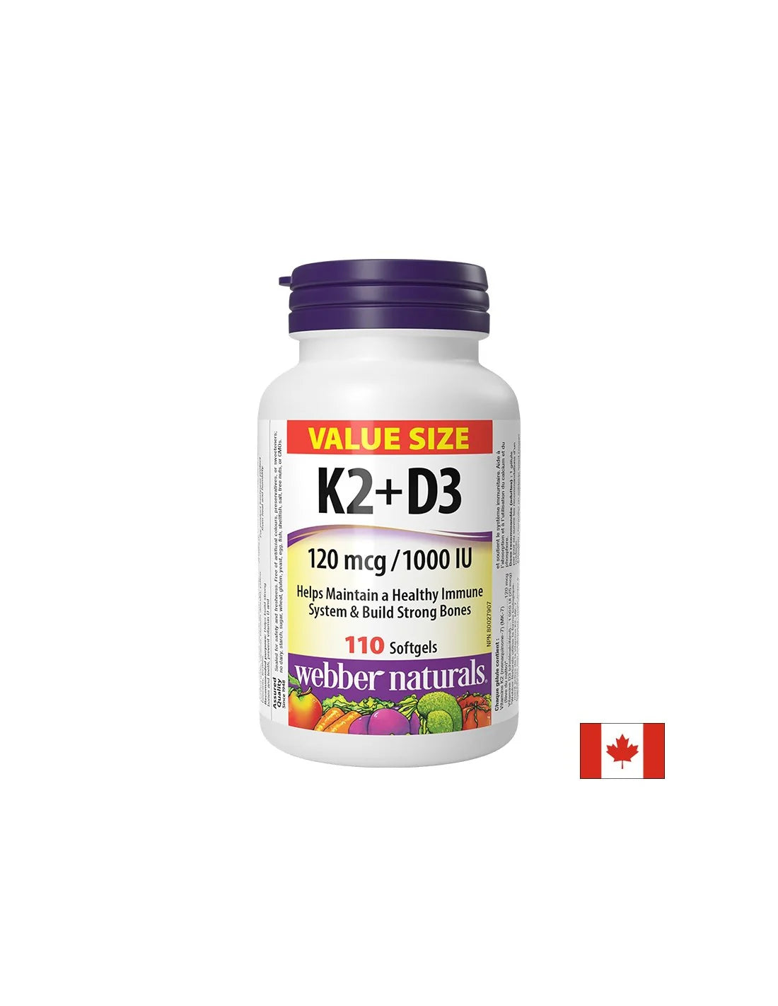 Витамин K2 120 µg + D3 1000 IU / 25 µg на канадската компания Webber Naturals e натурален продукт допринасящ за доброто състояние на костите, зъбите и ставите.