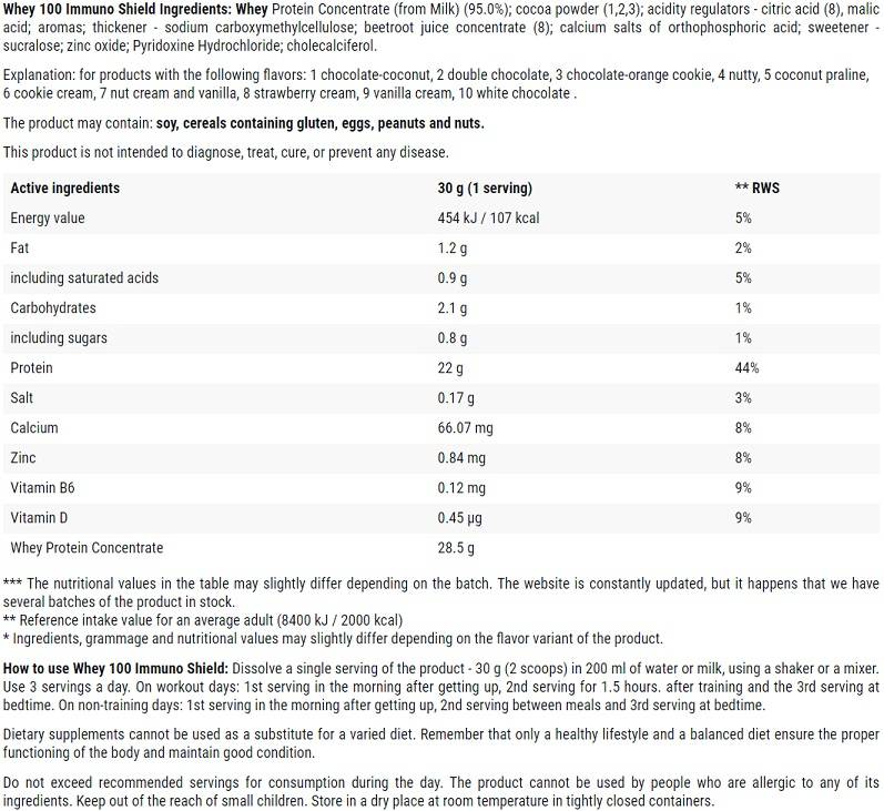 100% Whey е произведен чрез ултрафилтриращ процес, благодарение на което той съдържа много малко мазнини и лактоза. Продуктът се разтваря еднакво добре и в мляко и във вода. Предлага се в 13 завладяващи вкуса.